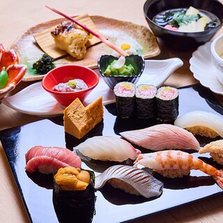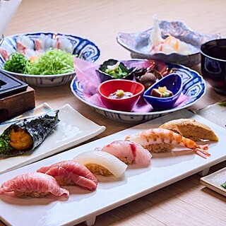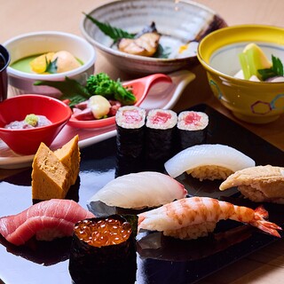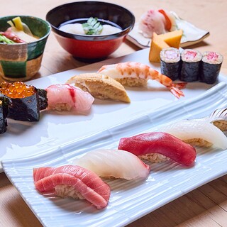 旨肴/茶碗蒸し/雲丹/特上握り十貫/玉子/巻物/お椀/甘味